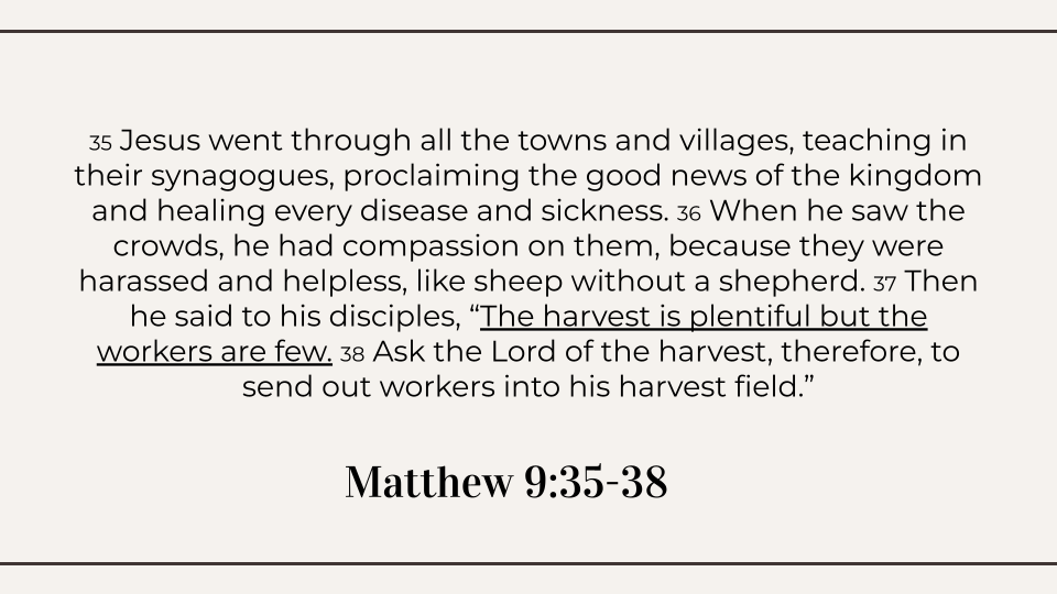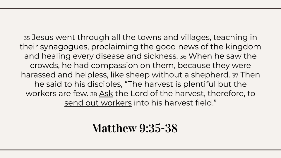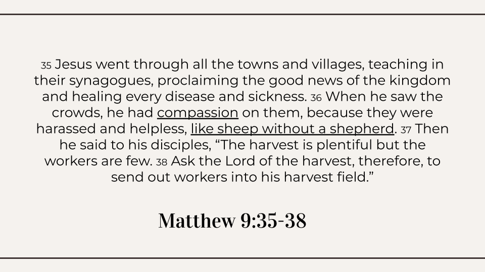 35 Jesus went through all the towns and villages, teaching in their synagogues, proclaiming the good news of the kingdom and healing every disease and sickness. 36 When he saw the crowds, he had compassion on them, because they were harassed and helpless, like sheep without a shepherd. 37 Then he said to his disciples, “The harvest is plentiful but the workers are few. 38 Ask the Lord of the harvest, therefore, to send out workers into his harvest field.”